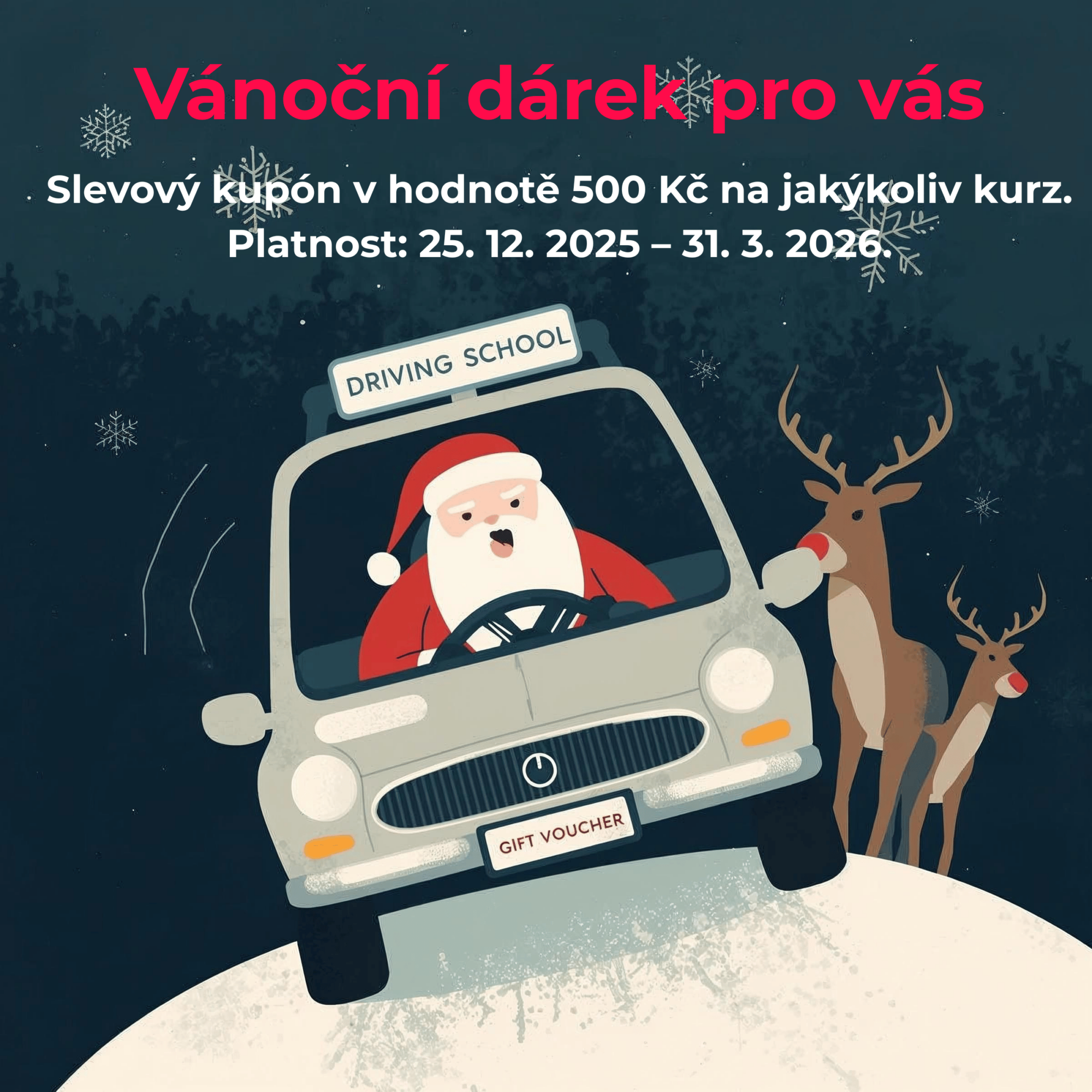 Plánujete si v příštím roce udělat řidičský průkaz? Nebo ho chcete darovat někomu blízkému? Vánoční slevový poukaz v hodnotě 500 Kč vám pomůže snížit cenu vybraného kurzu. pro získání řidičského oprávnění.